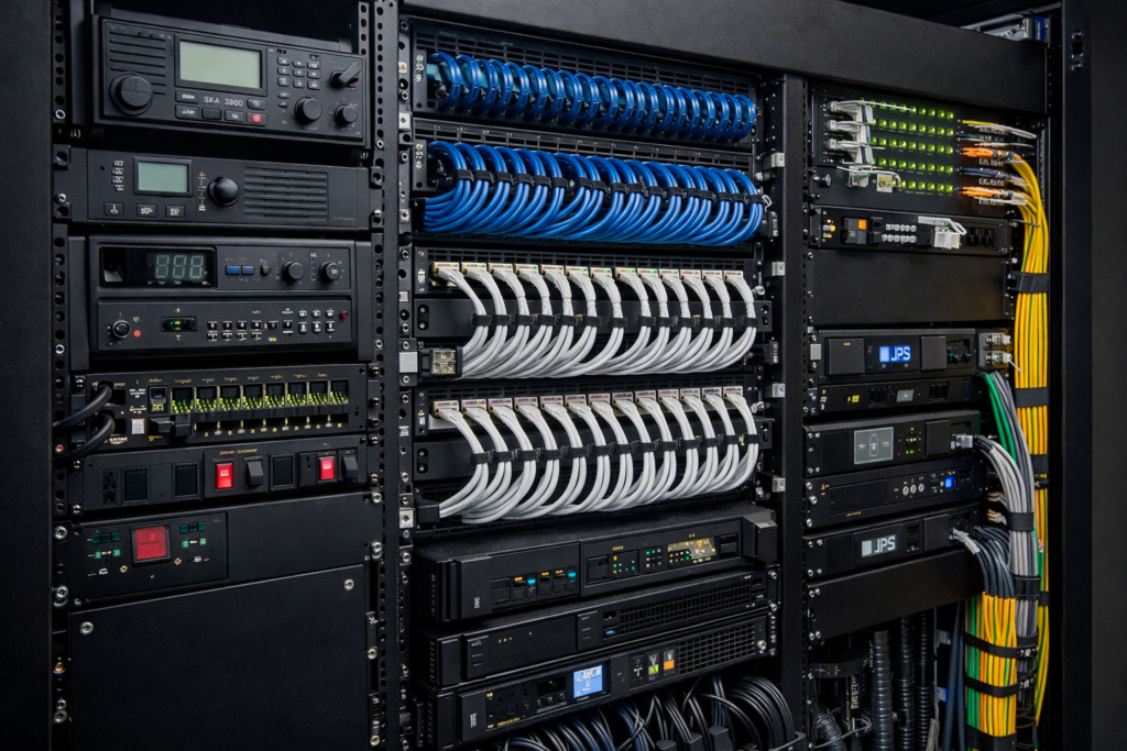Structured cabling, fire safety, access control and integrated security infrastructure designed for reliability and compliance.